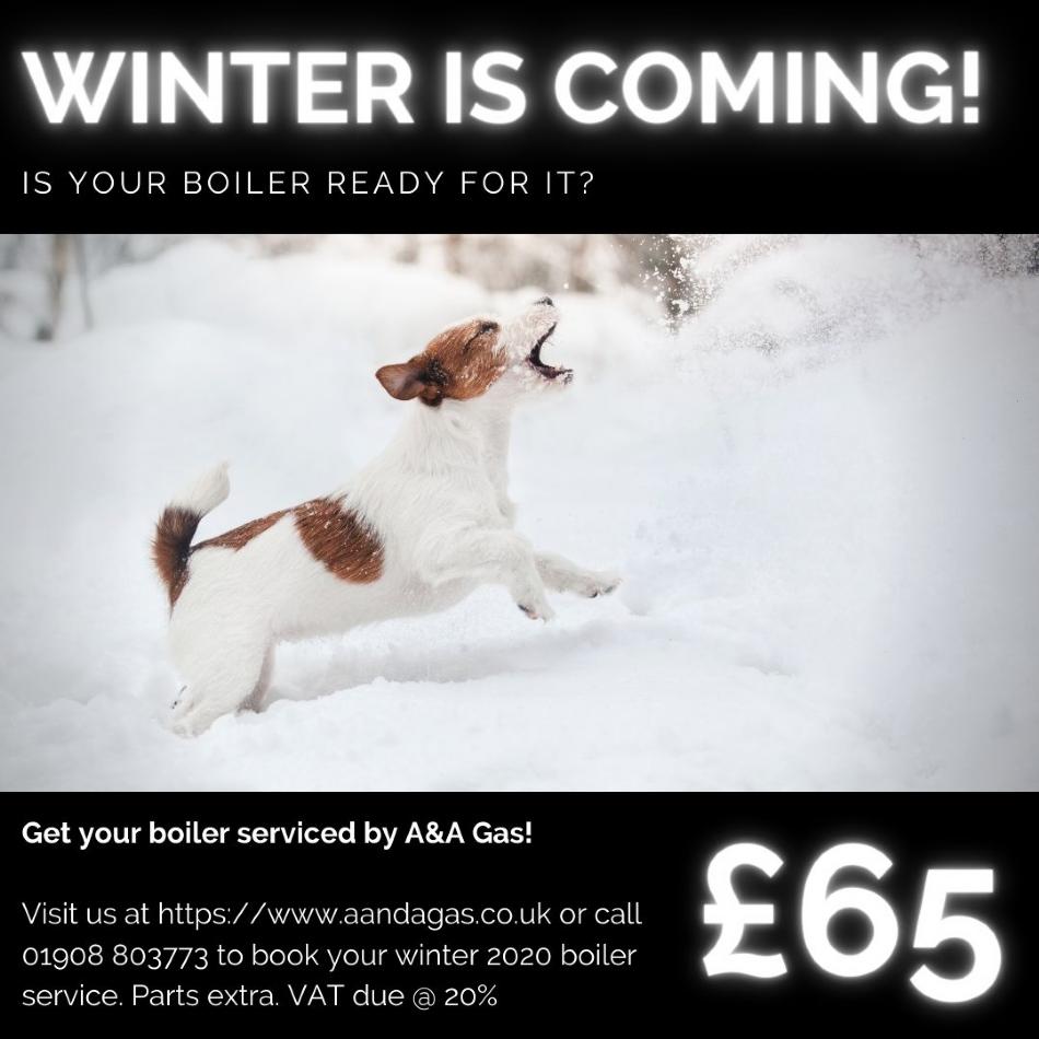 |  Content Type: Graphic Click-Throughs So Far: 68 Canonical URL: https://aandagas.co.uk/ Description: We'll service your boiler for just £65 and ensure your home is cosy and warm ready for winter. Parts extra. VAT due @ 20%. Call us on 01908 803773 or visit slo2.link/188 to book your boiler service today ...